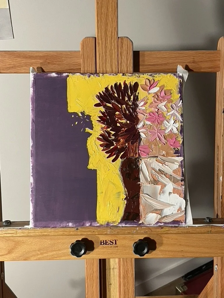 I took some photos and analyzed the colors and trying to understand how to translate that to oils. The darkest parts of the flower appear to me to be about right for alizarin crimson straight from the tube. The vase itself and most of the shadows are tan/brown, where the wilted husks of the flowers appear almost Naples Yellow + Alizarin Crimson. There’s a wash of some sort of burnt umber, a peachy, mostly-red color— the mass of dead pedals. Averages out to almost-orange. The stems are not super green, but they’re mostly green, red, and tan (but not quite Naples Yellow).